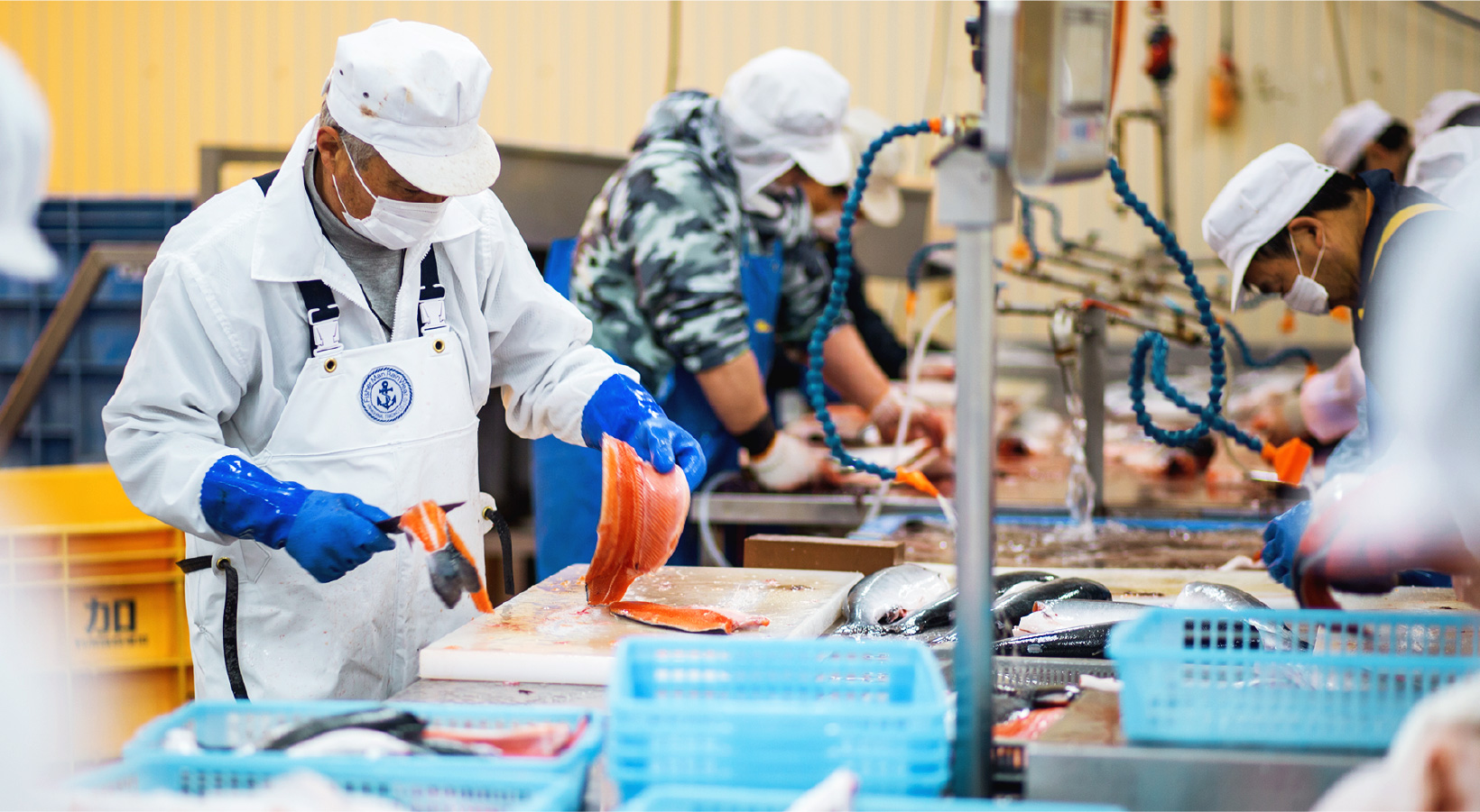 「銀王」となるべき稚魚を見極めること、銀鮭本来の旨味を引き出す餌にこだわること、スピード水揚げ・加工など、創業当初から一貫体制をとることで変わらぬ鮮度と美味しさを約束します。